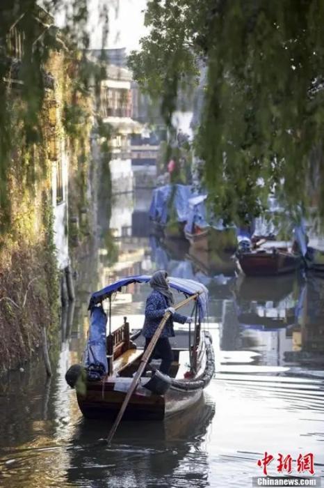 船娘劃著船在河道中行駛。中新社記者泱波攝