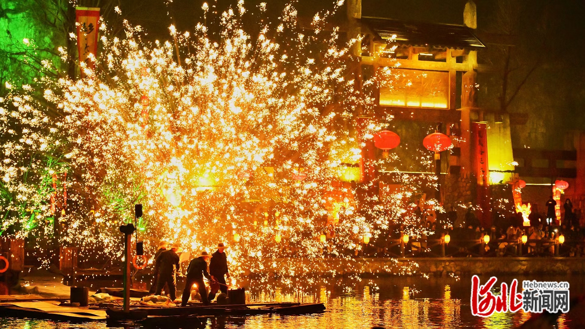 1月30日,游客在易縣太行水鎮觀看水上打鐵花表演。河北日報記者李佳澤攝
