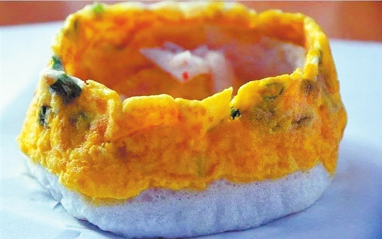 “不翻兒”名字的由來還有另一層意思。濟源地處黃河最后一道出山口,水流兇猛。古時的漁民最怕翻船,為了祈求平安,將隨身攜帶的這種面食稱為“不翻兒”,寄托著漁民對美好、平安的向往?!安环瓋骸鄙珴甚r亮,上層雞蛋燦黃如金,下層米面潔白如玉,中間較薄酥脆無比,外圍較厚噴香撲鼻。