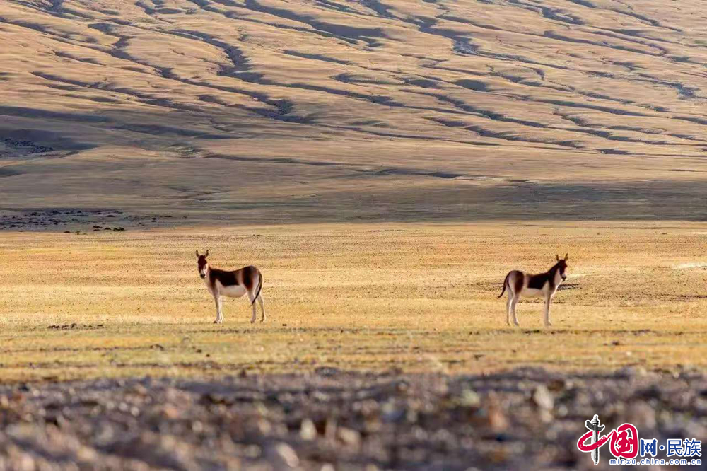 多爾瑪村附近的草原上,兩只野驢在散步。蔡得軍攝