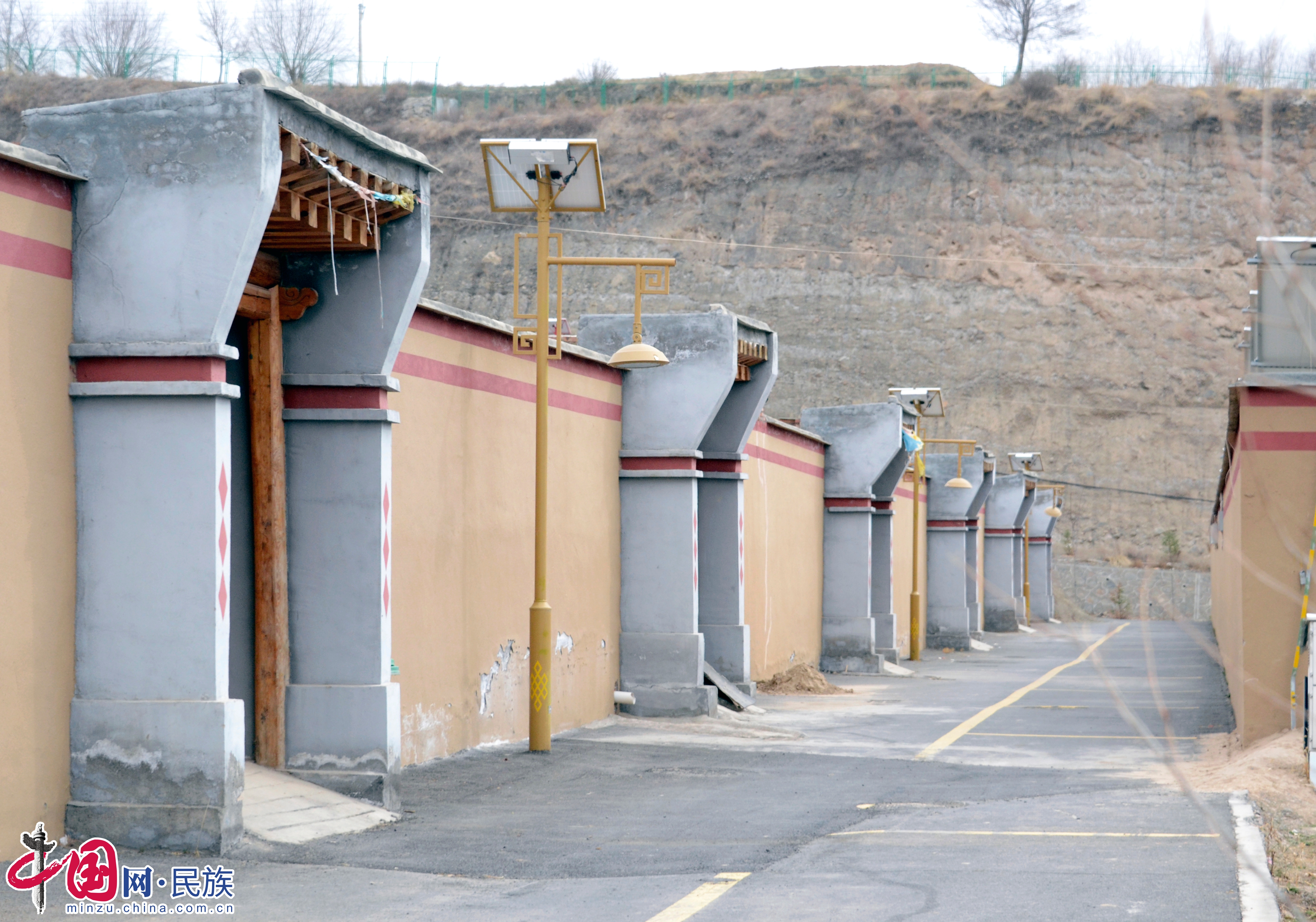 如今的來玉村,一幅如詩如畫的景象便會映入眼簾。沿著河岸緩坡,16排99戶藏式民居錯落有致地排列著。統一的沙土色圍墻,上方與房檐銜接處采用絳紫色雙線勾邊裝飾,為村莊披上了一件華麗的外衣。陽光灑在屋頂,一排排光伏板閃爍著金屬的光澤,它們正源源不斷地將光能轉化為電能,為村莊的發展注入新的動力。