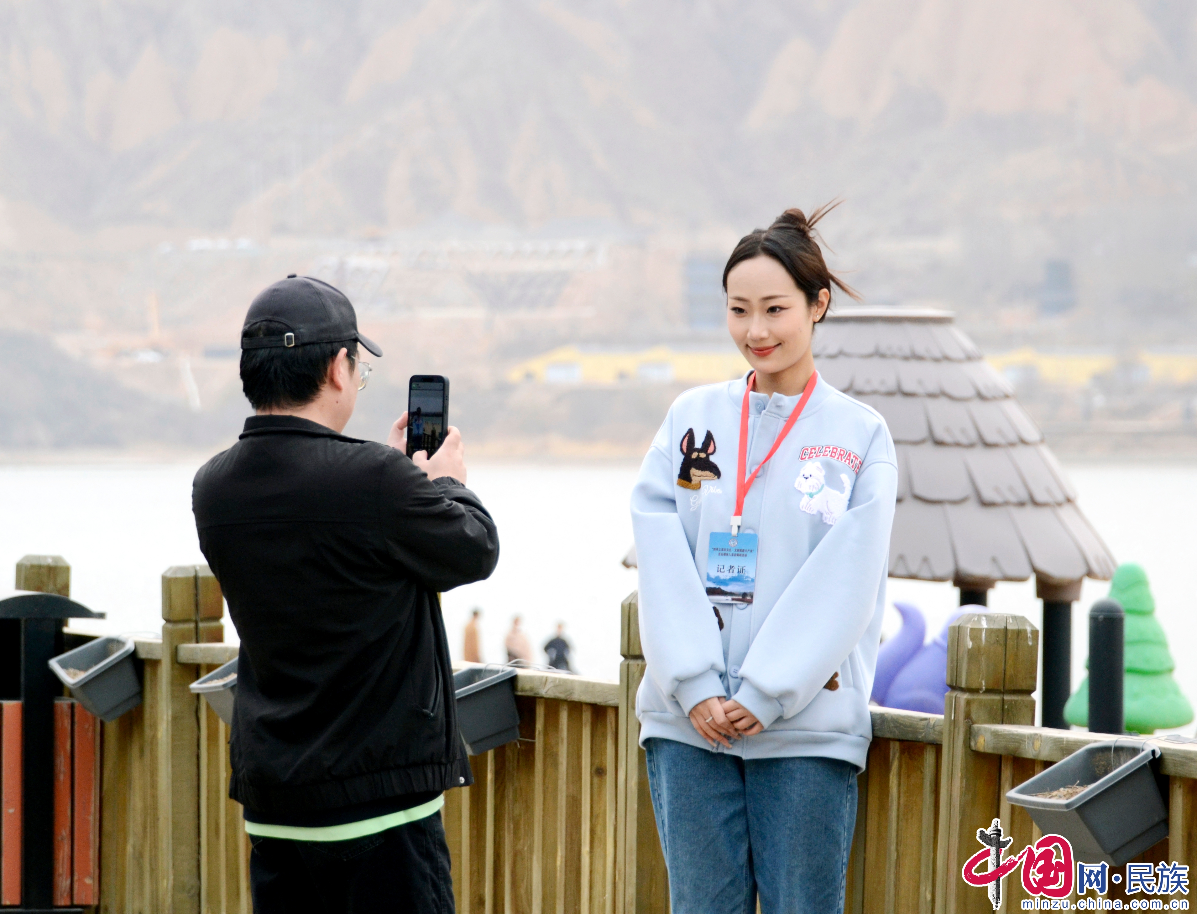 采訪團成員在來玉村拍照打卡