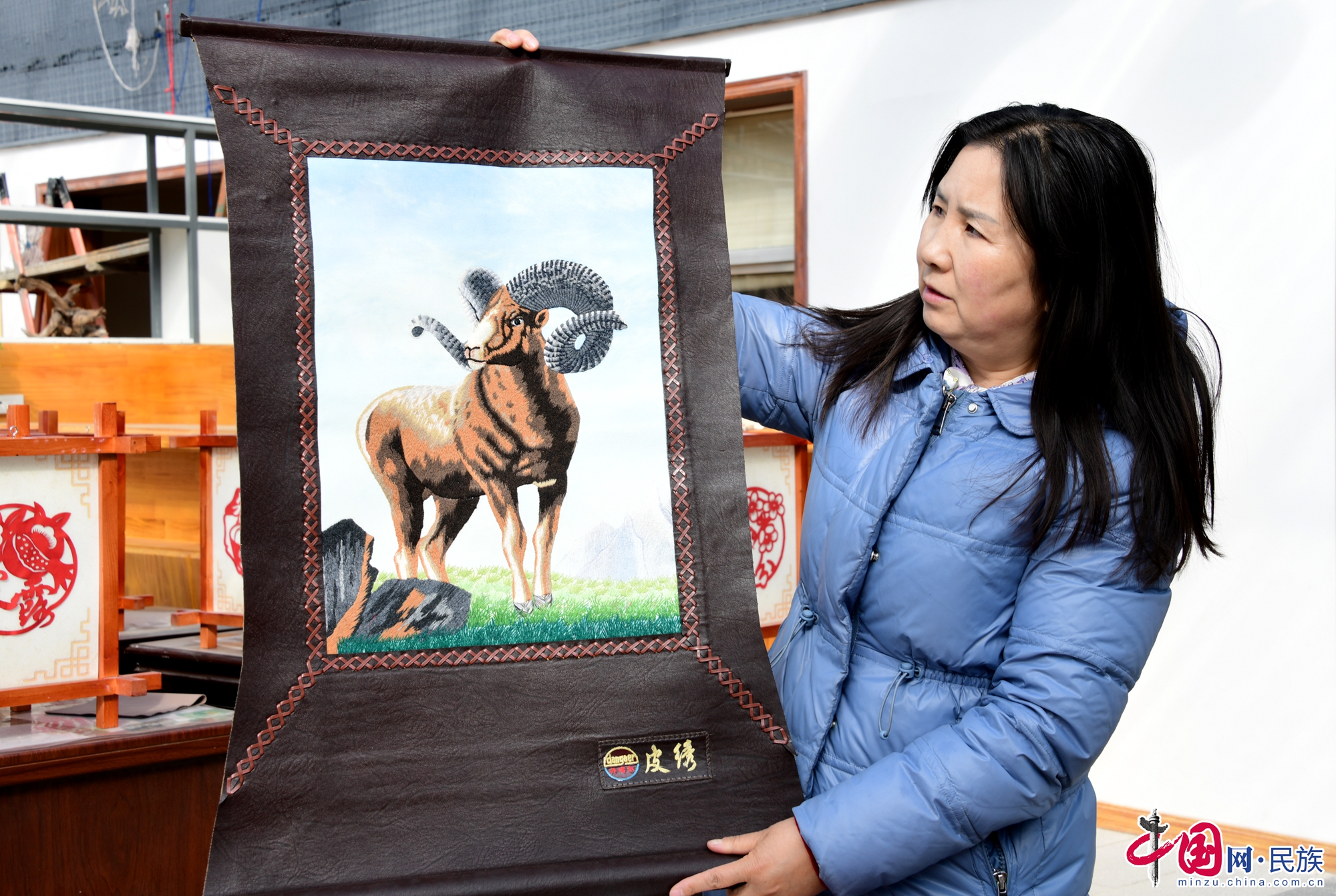非遺傳承人李永清在展示丹噶爾皮繡作品。蔡得軍攝