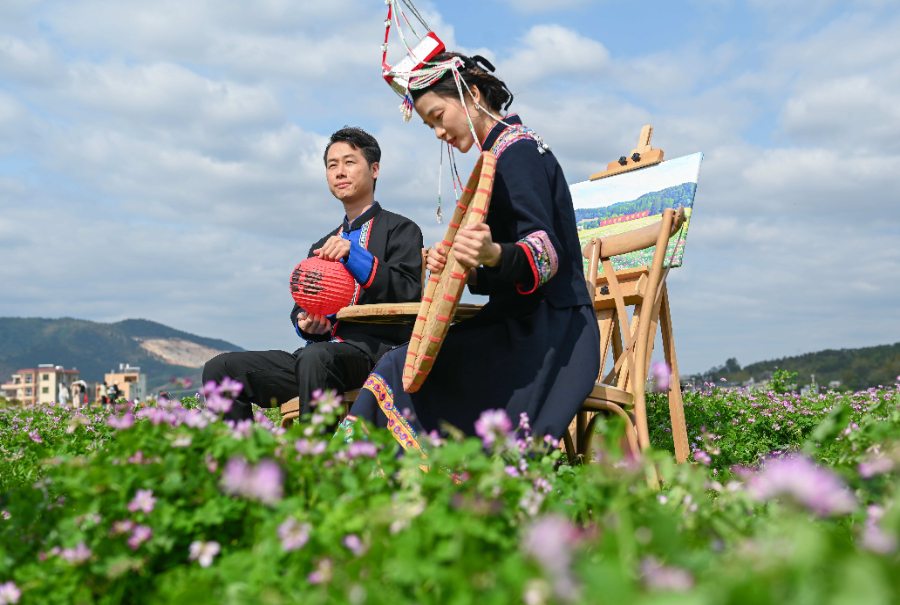 2025年3月16日,新人在廣東河源市東源縣柳城鎮的紫云英花海中婚拍留念。新華社記者肖恩楠攝