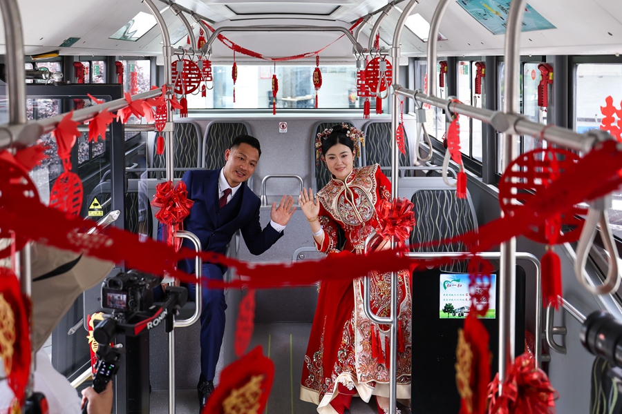 2025年4月30日,“愛情巴士”搭載著新郎新娘前往浙江諸暨市同山鎮唐仁村祠堂進行婚禮儀式。新華社記者江漢攝