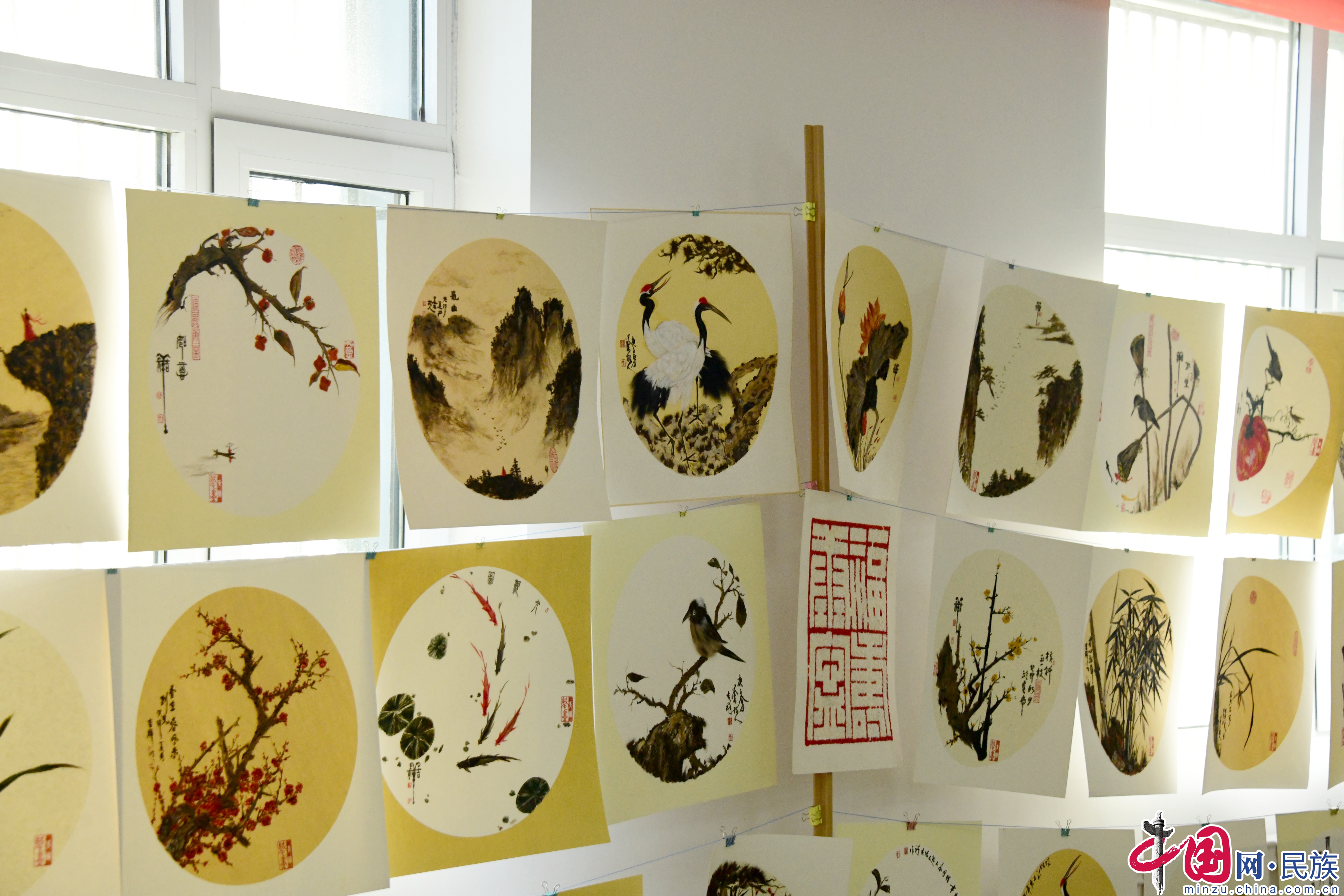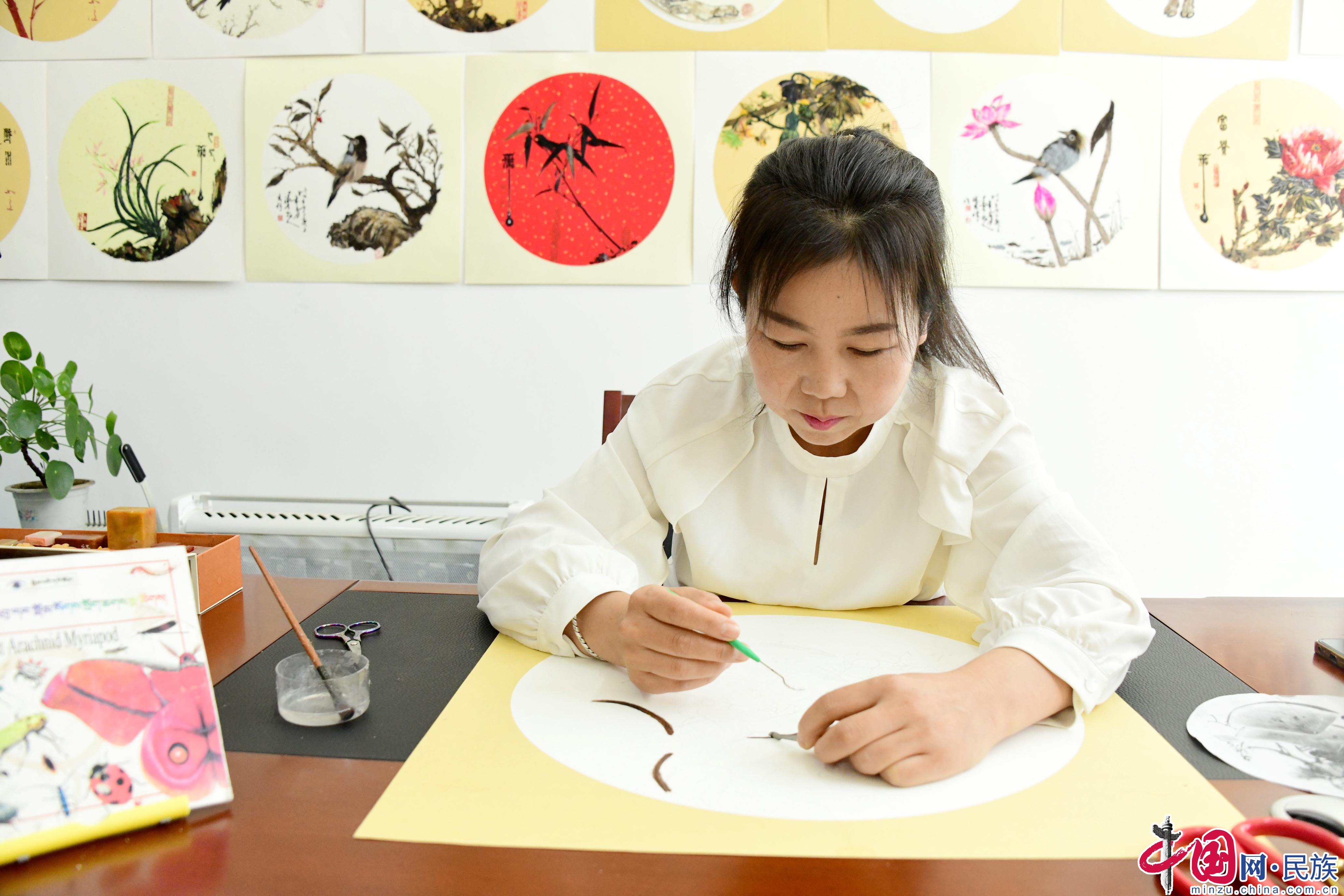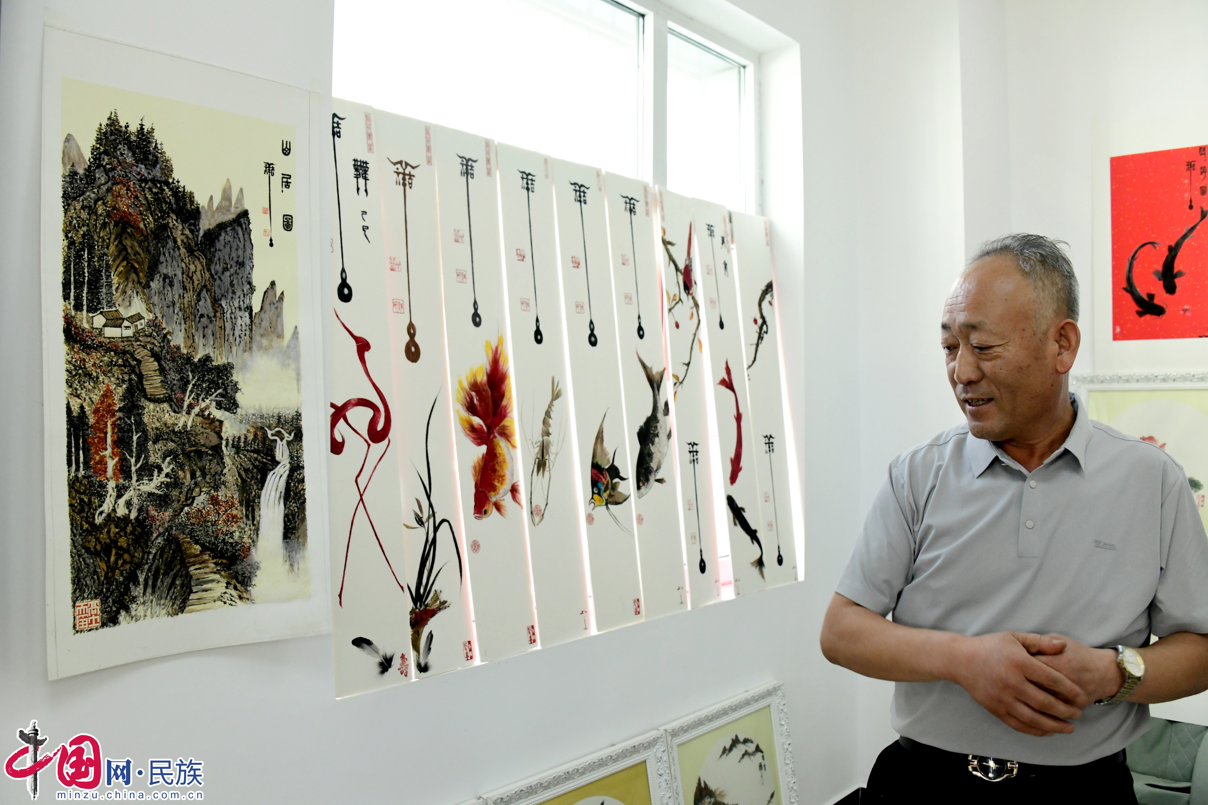 張吉祥在介紹絨毛畫《山居圖》(左一)。蔡得軍攝